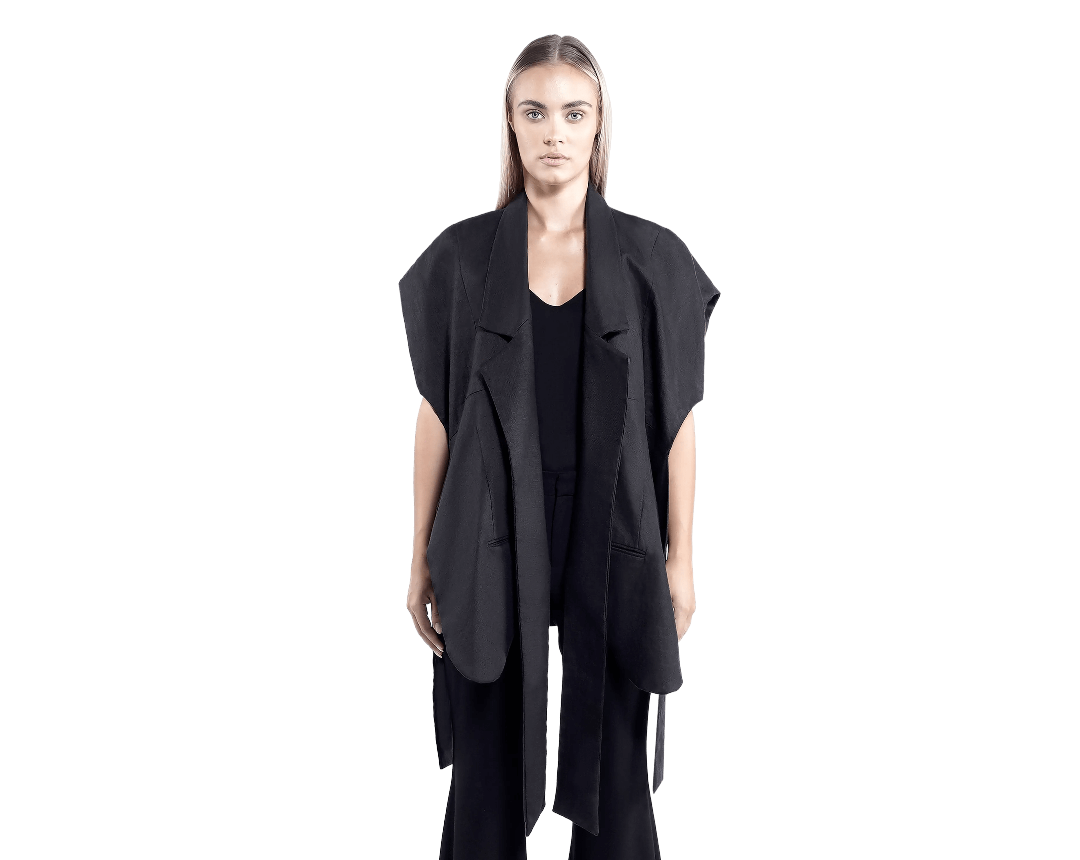 An asymmetrical, open-front top with sculpted shoulders and fluid paneling, designed to drape softly across the body while creating a confident, architectural silhouette.